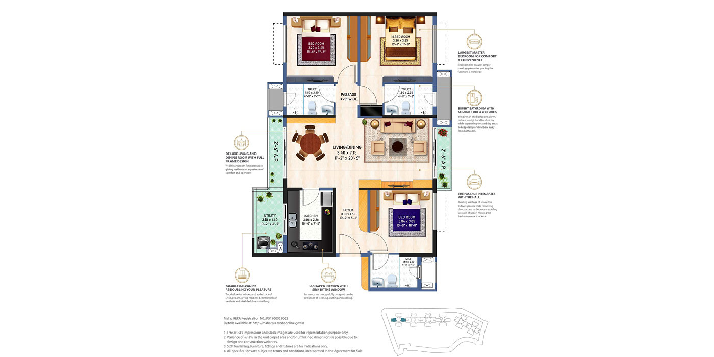 The images and other details herein are only indicative. The Promoter reserves the right to change any or all of these in the interest of the development, as per provision of law. Artist’s impressions are used to illustrate amenities, specifications, images, and other details. Tolerance of +/- 3% is possible in the unit areas on account of design and construction variances. All brands stated are subject to final decision of the project architect. This electronic / printed material does not constitute an offer and/or contract of any type between the Promoter and the recipient. No booking or allotment shall be deemed to have been made on the basis of this electronic / printed material. Any Purchaser / Lessee of this development shall be governed by the terms and conditions of the agreement for sale / lease entered into between the parties, and no details mentioned in this electronic / printed material shall in any way govern such transactions unless as may be otherwise expressly provided in the agreement for sale/lease by the Promoter. The Promoter does not warrant or assume any liability or responsibility for the accuracy or completeness of any information contained herein. This electronic / printed material has been created keeping in mind the provisions of the Real Estate (Regulation and Development) Act, 2016 (RERA) applicable for projects in Maharashtra. You are required to verify all the details, including area, amenities, services, terms of sales and payments and other relevant terms independently with the Promoter’s sales team only, by physically visiting the project site and the authorized website of RERA. You are requested NOT to visit any unauthorized or unverified website/broker (online / offline) to receive any information about any projects of the Promoter and/or its sister concerns. *Terms & Conditions Apply.